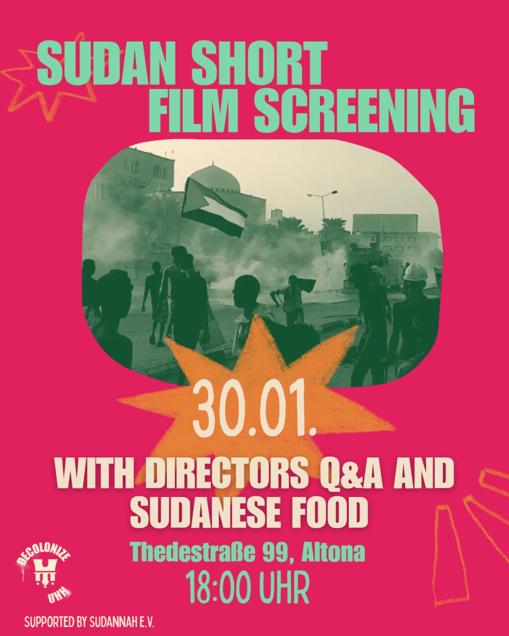 Nachdem Screening werden wir mit den Filmemacherinnen ins Gespräch kommen und den Abend mit sudanesischem Essen (gegen Spende) ausklingen lassen.